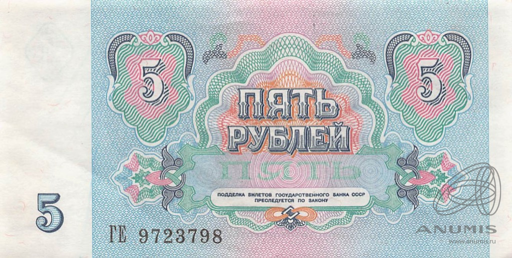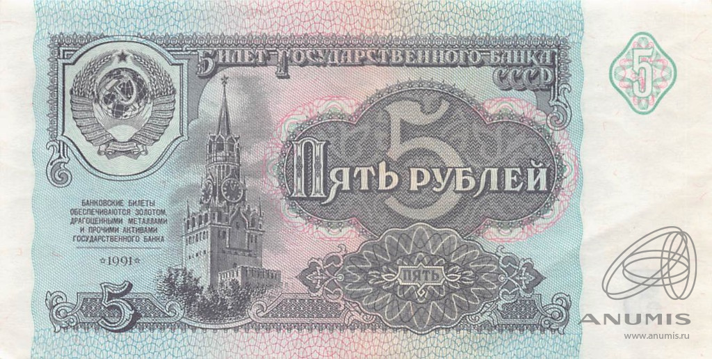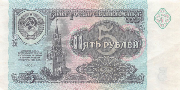 Банкнота регулярного выпуска: 5 рублей 1991 года. Билеты Государственного Банка СССР 1991 г. Союз Советских Социалистических Республик: Госбанк СССР (1991 — 1992).